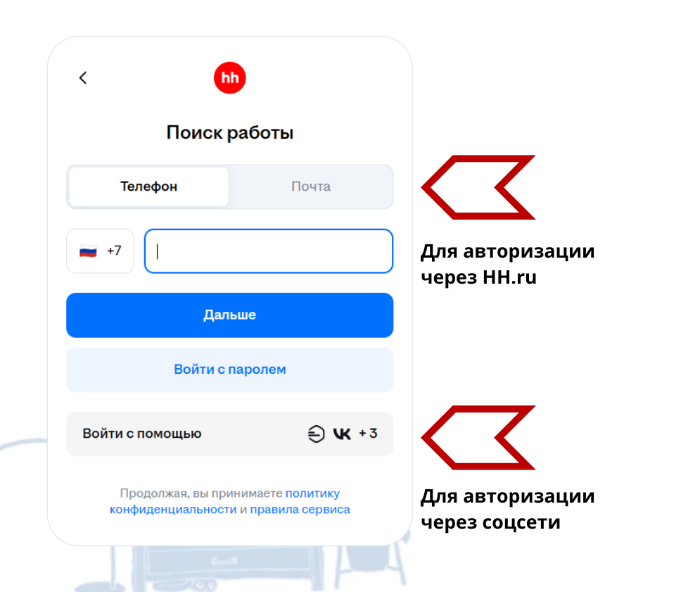 На сайте можно авторизоваться с помощью учетной записи hh.ru или через соцсети.